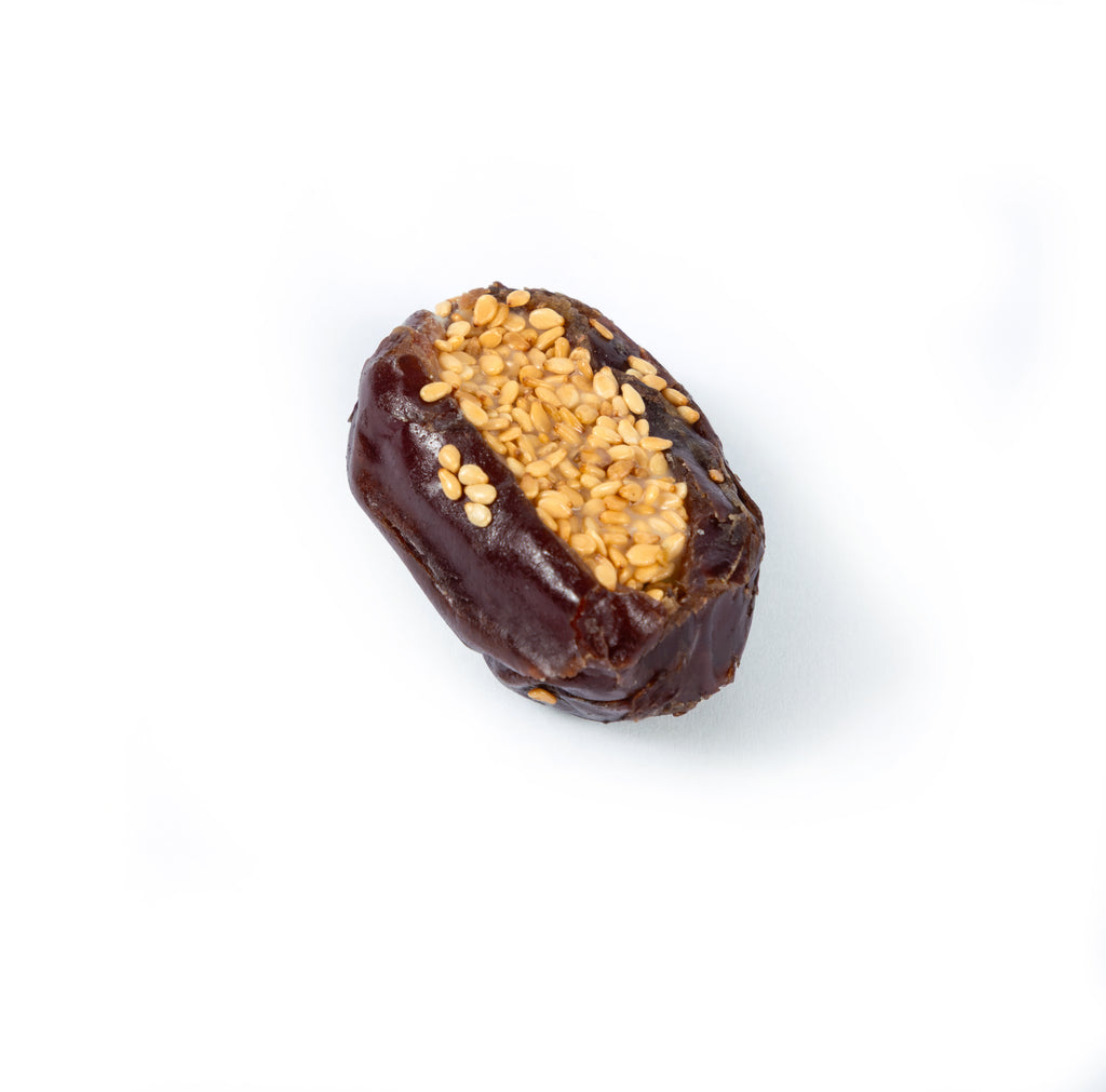 Enjoy the rich harmony of soft, naturally sweet dates filled with creamy halawa and topped with golden sesame seeds. These Dates with Halawa & Sesame bring together the deep caramel notes of premium dates with the nutty, smooth flavor of sesame for a comforting and indulgent bite. Each date is carefully selected for its tender texture and generously filled to create a perfectly balanced treat that’s both traditional and satisfying.